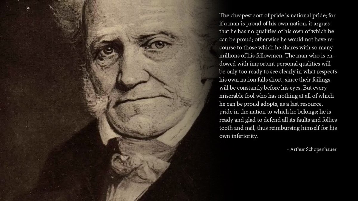 “But every miserable fool who has nothing at all of which he can be proud adopts, as a last resource, pride in the nation to which he belongs; he is ready and glad to defend all its faults and follies tooth and nail, thus reimbursing himself for his own inferiority.”pic.twitter.com/5UtOGcyTCH