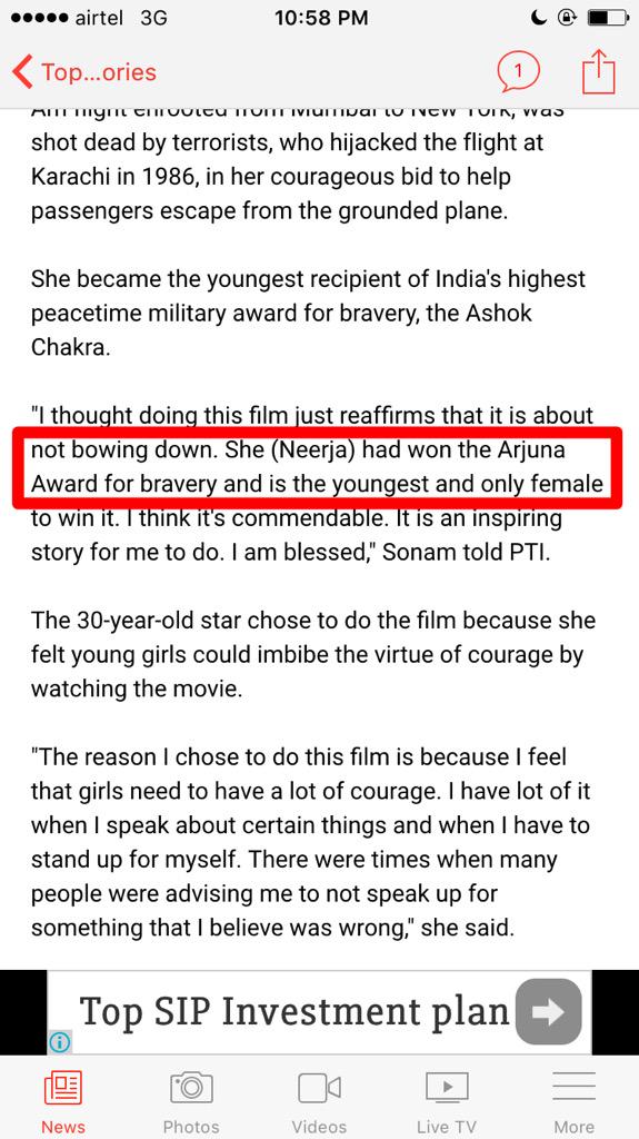 Did @ndtv misquote @sonamakapoor or did she actually say "arjuna award for bravery"?!?!?pic.twitter.com/i3fBKwLGOE