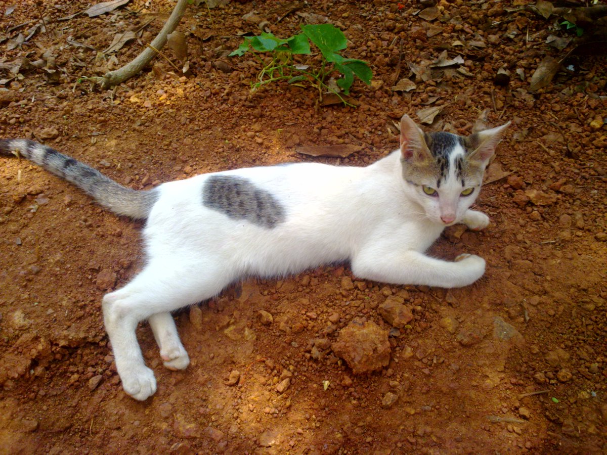 The cat next to the horses.