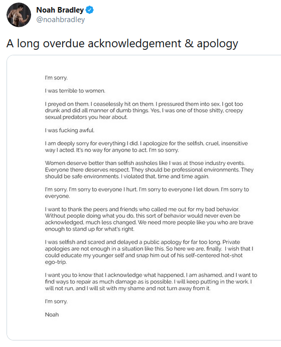 In June Noah Bradley admitted to raping women. Noah was then fired by Wizards of the Coast and his Artstation account was deleted. He has since deleted his apology. He does not get to pretend this did not happen.pic.twitter.com/rhBHK0tQww