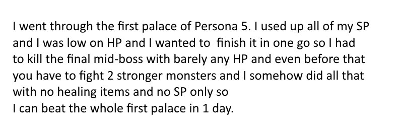 Persona 5: Really tough boss in the final palace, Protagonist was only member alive, boss kept missing heavy attacks, won with 10HP