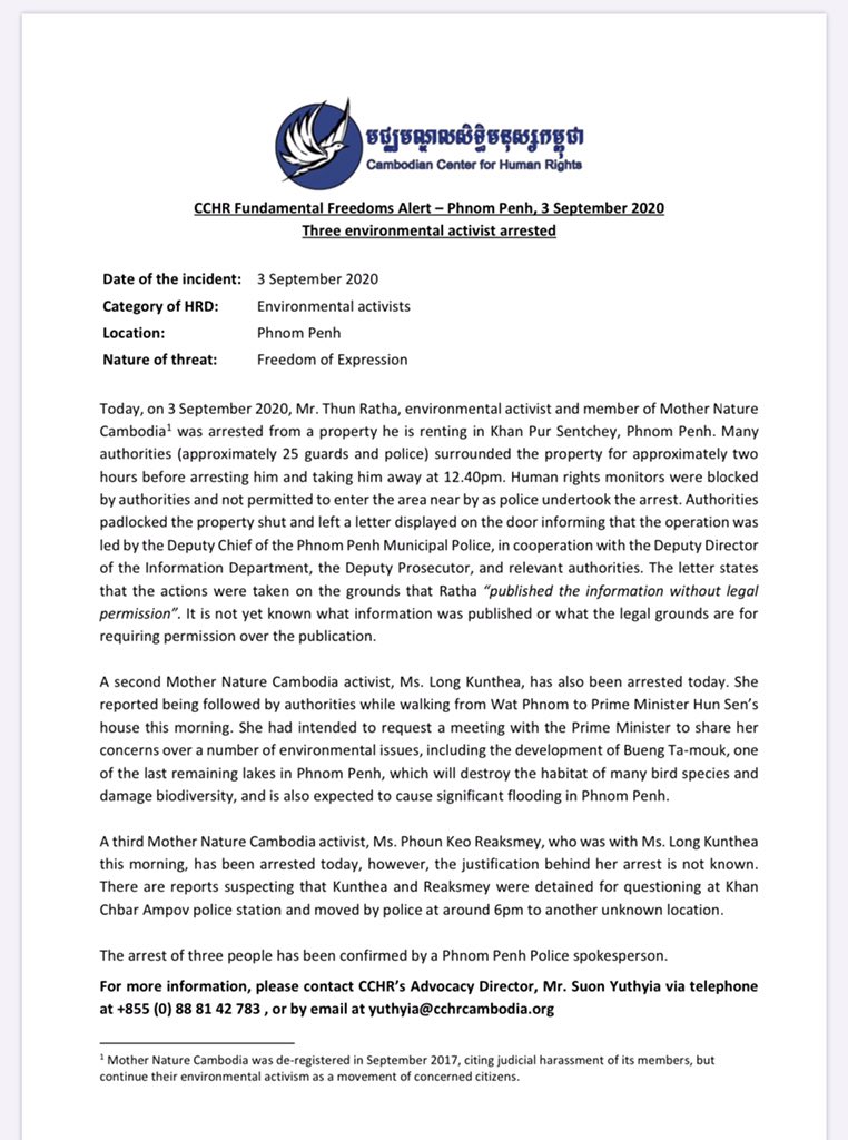 Three environmental activists arrested today, find out info via @cchrcambodia Fundamental Freedom Alert here.pic.twitter.com/eGLPnTkeeD
