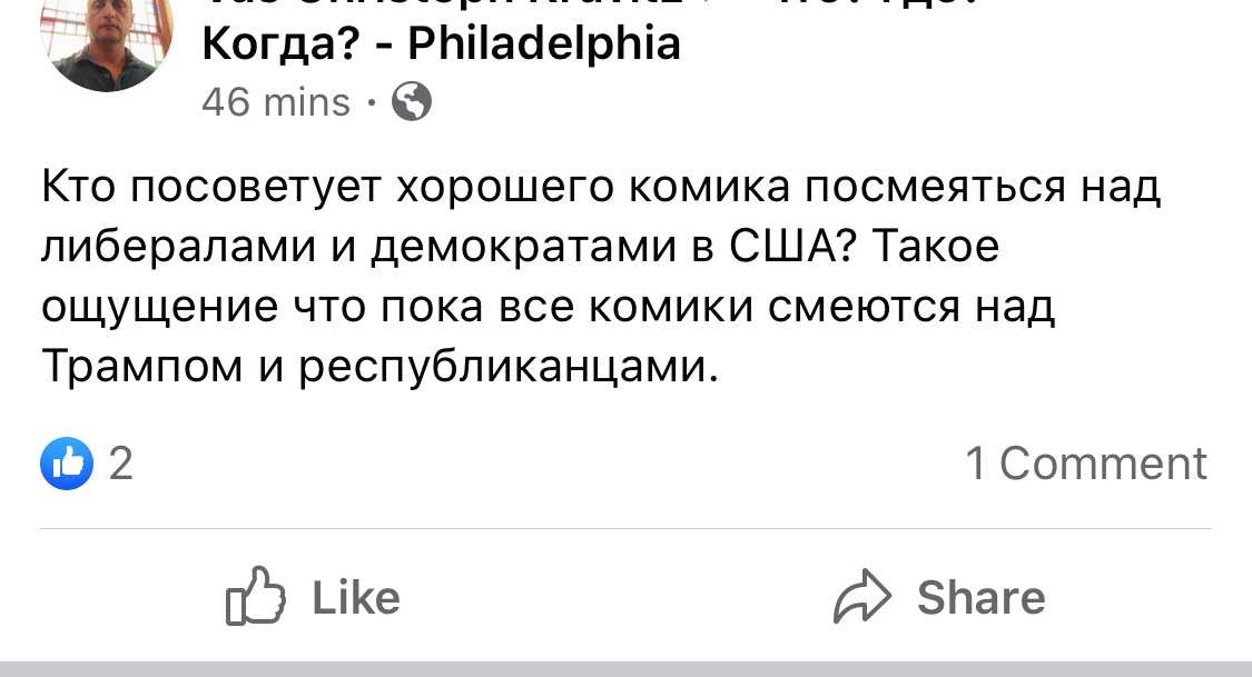 Found on a Russian-language local FB group: ‘Can someone recommend a comedian who makes fun of the American liberals/democrats? I get a feeling that so far all comedians make fun of Trump and the Republicans’pic.twitter.com/HYHuwZidh5