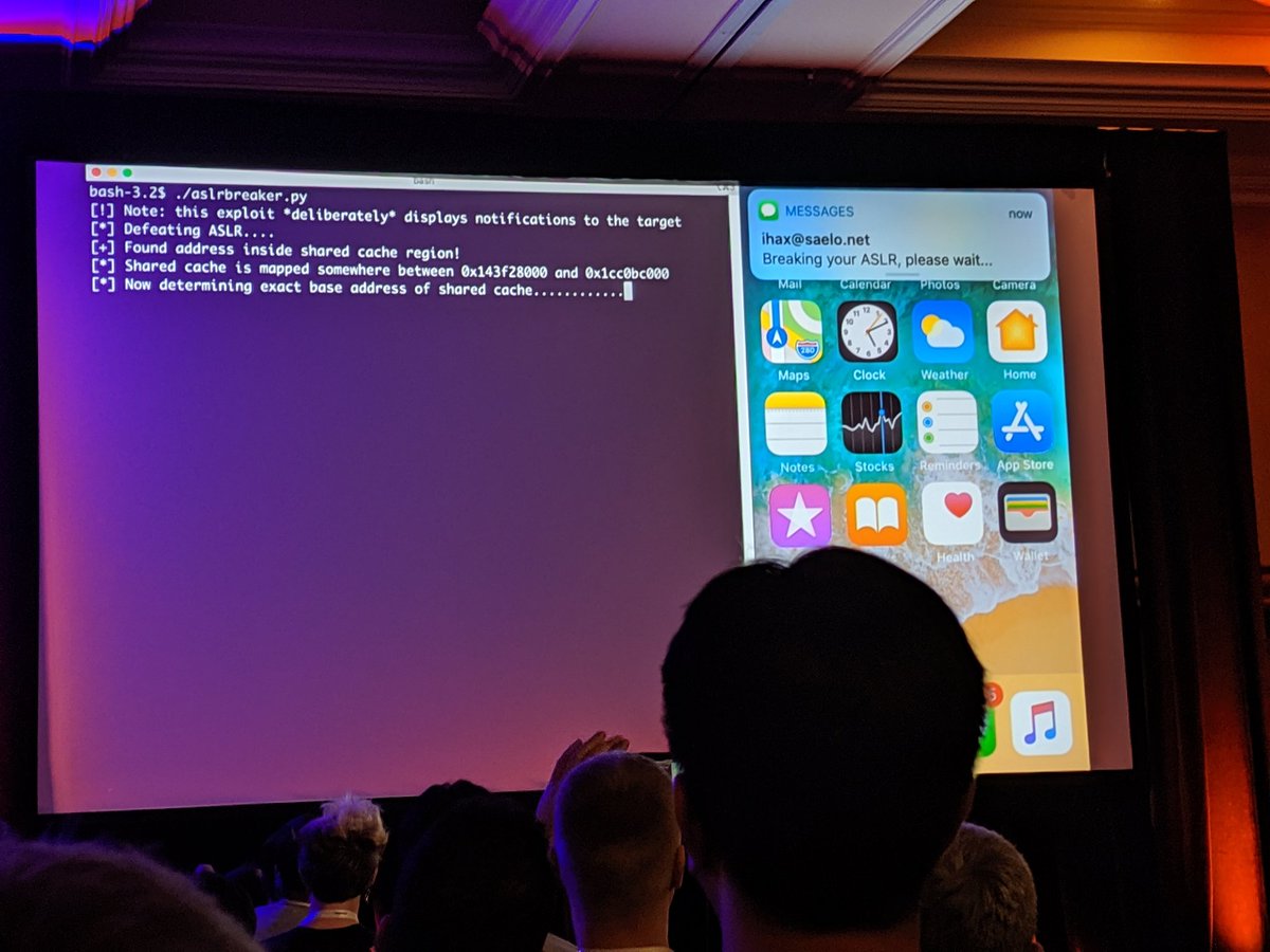 @natashenka sharing the bugs that she and@5aelo found in iMessage. And closing it out with a demo of a "no hands required!" exploit. "Breaking your ASLR, please wait..."pic.twitter.com/poPXza3dF0