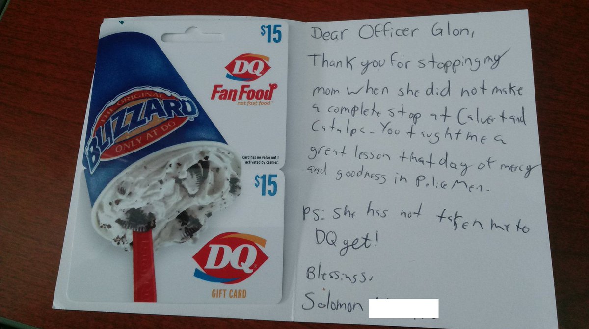 A mother brought her son in today to deliver this card to Officer Ron Glon. Mom got a warning since she promised to get Solomon a blizzard. Officer Glon was touched by this nice gift, he is bringing Solomon a blizzard on this hot day.pic.twitter.com/BVlQth1H5t