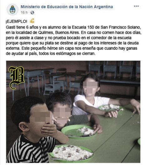 #OtroPolémicoPosteo Ahora el Ministerio de Educación destaca a un nene que no come hace dos días pero no consume nada en el comedor de la escuela para que destinen la plata de su vianda al pago de los intereses de la deuda. Nota completa: https://goo.gl/Vut5zP pic.twitter.com/MKUHIzvBcR