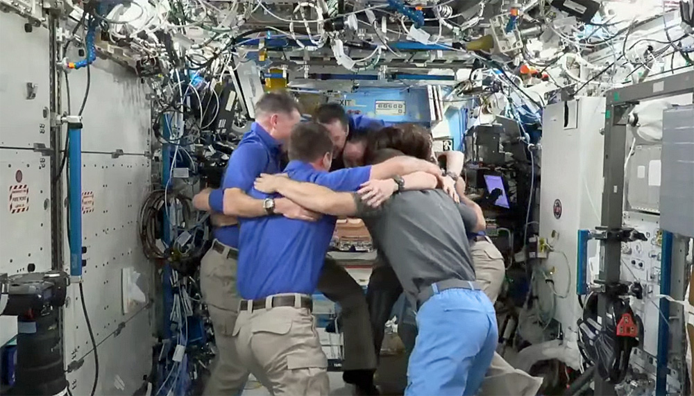 F9/Crew-2: Anton Shkaplerov (front right) is now in command aboard the International Space Station; at the end of a short change-of-commander ceremony, the 7-member crew shared a group hug amid preparations for Crew-2's undocking Sundaypic.twitter.com/PWDWm2uwAU