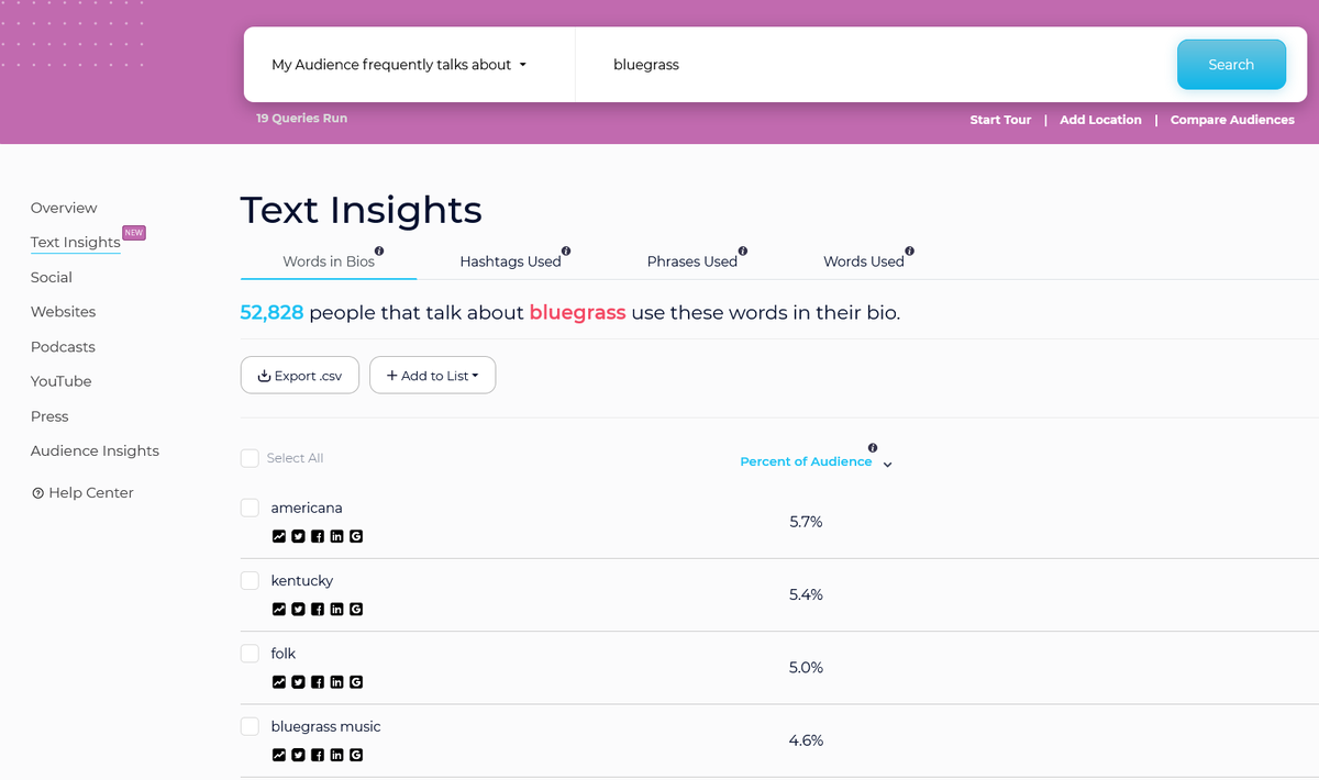 NEW in SparkToro: https://sparktoro.com/blog/new-in-sparktoro-content-and-profile-text-insights/ … A whole new tab! 4 Subsections with up to 250 rows of data: - What your audience uses in their profile text - What hashtags they use in posts on IG, TW, FB, LI, etc. - What words + phrases they use We've also added the ability to...pic.twitter.com/S9Qtjt34nu