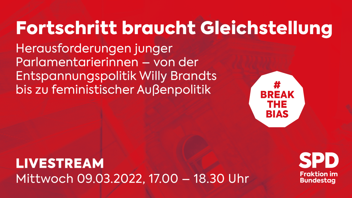 #Frauentag und die aktuellen Entwicklungen in Europa zum Anlass, um über den Zusammenhang von Außenpolitik und Gleichstellung zu sprechen: https://www.spdfraktion.de/termine/2022-03-09-fortschritt-braucht-gleichstellung-breakthebias …pic.twitter.com/Uwqp1BobMV