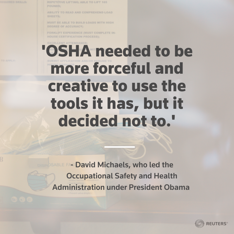 The pandemic presented OSHA, the nation's workplace safety watchdog, with a steep challenge. As outbreaks hit a wide range of industries, the resource-starved agency struggled to keep up https://reut.rs/3rYJQsN pic.twitter.com/KTvPXbX89G