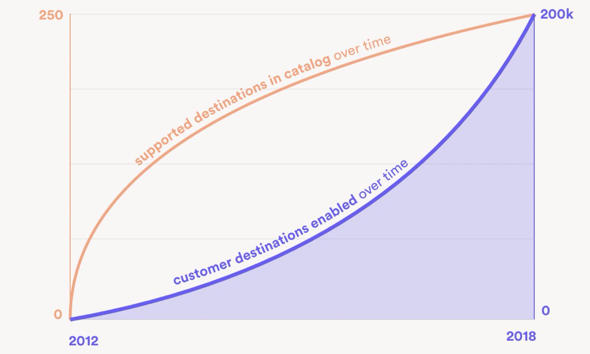 In the early years, it paid off. In those first 2 years, we shipped ~100 integrations. And customers flocked to “the right way to collect and route customer data.” But as we scaled up, the growth of the catalog of destinations actually slowed. Why?pic.twitter.com/0hXhKz3FqT