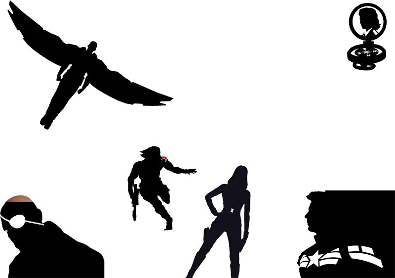 All silhouettes will be glitter. Steve's hair is very spiky and I can't find good reference and may have to replace it with a cowl pic.