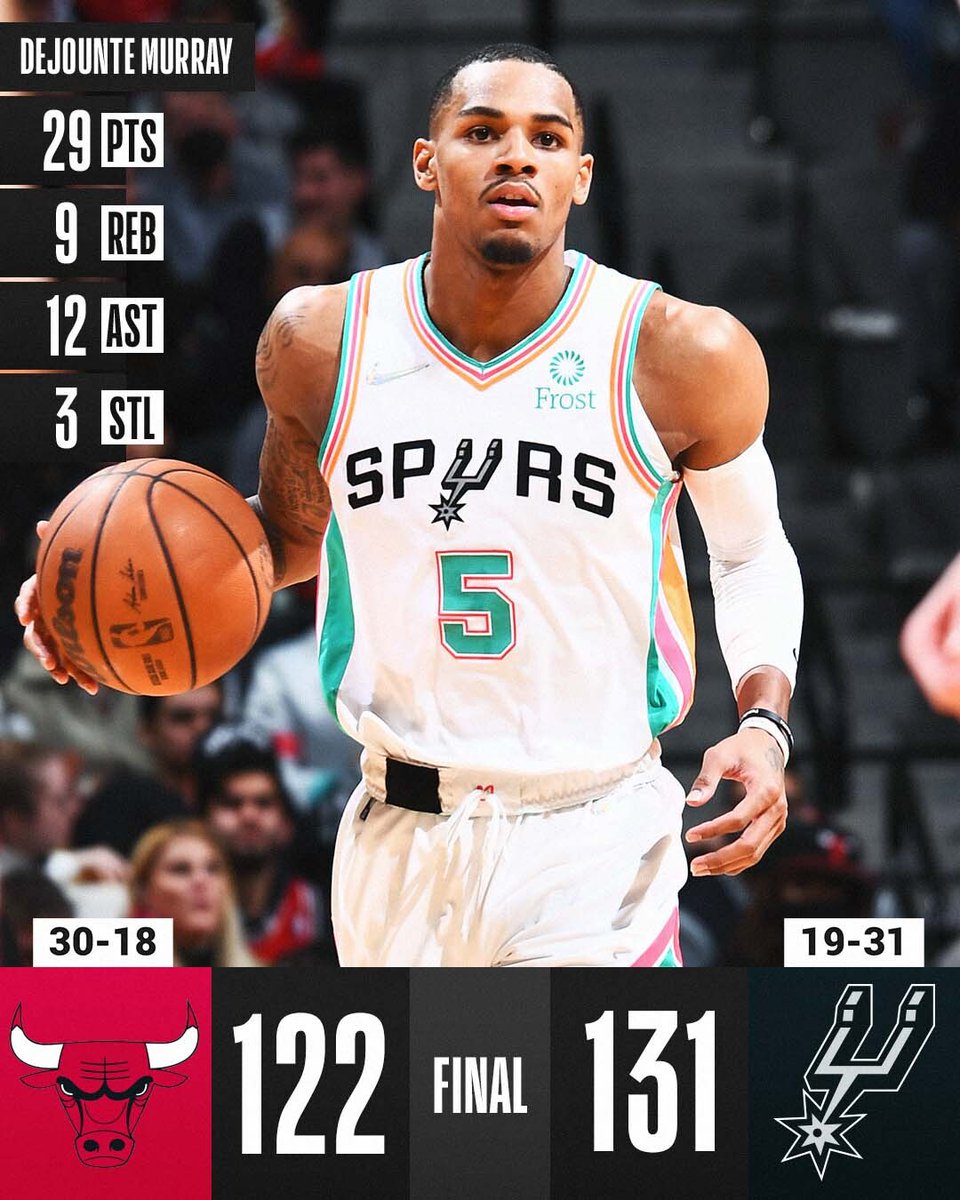 @spurs to victory! Dejounte Murray: 29 PTS, 9 REB, 12 AST, 3 STL Keldon Johnson: 23 PTS, 8 REB Jakob Poeltl: 21 PTS, 11 REB DeMar DeRozan: 32 PTS, 6 REB, 8 ASTpic.twitter.com/igdxeG0Tmm