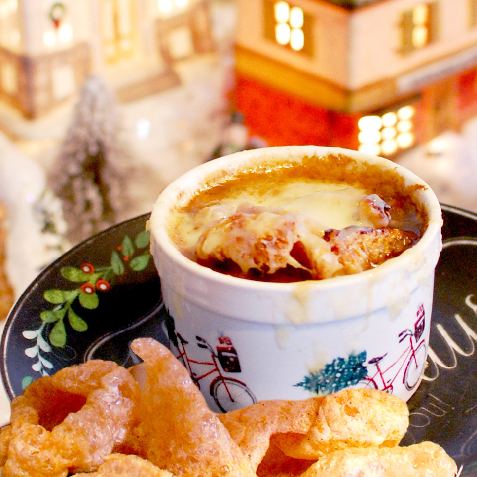 #PorkRindRecipe to warm you up! His unique French Onion Soup recipe uses our crunchy pork rinds covered in melted cheese