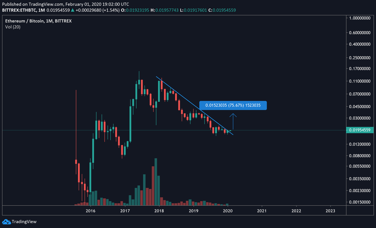 $ETH /$BTC After 2 years of a downtrend, ETH seems to be ready and already broke the downtrend. In next 1-2 months I do expect 50-70% retrace here. In USD value 350-400$pic.twitter.com/c2LzNQkCIf