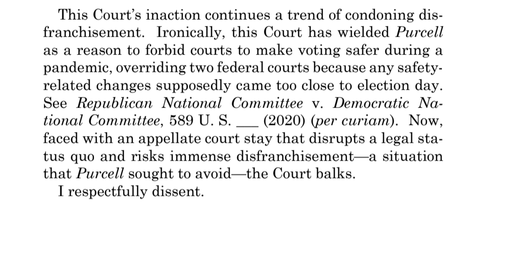News: Justice Sonia Sotomayor called out the way the supreme court has upheld voting restrictions during the pandemic. "This Court’s inaction continues a trend of condoning disfranchisement," she wrote.pic.twitter.com/nBG6awpqAg