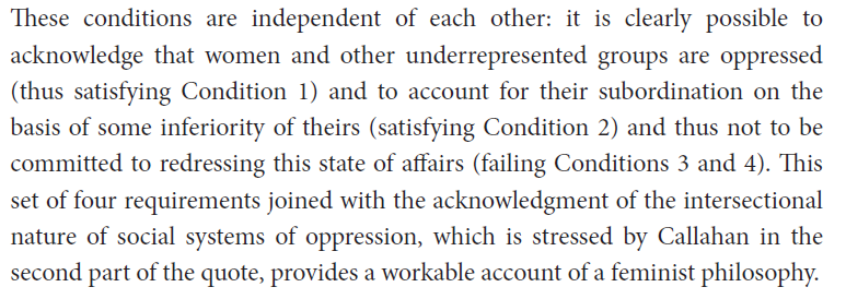 I'm idly browsing the "Bloomsbury Companion to Analytic Feminism" and may I just say that I am *delighted* that it starts with an axiomatic definition of feminism and then goes on to show that the axioms are independent of eachotherpic.twitter.com/OrFGg7YWa2