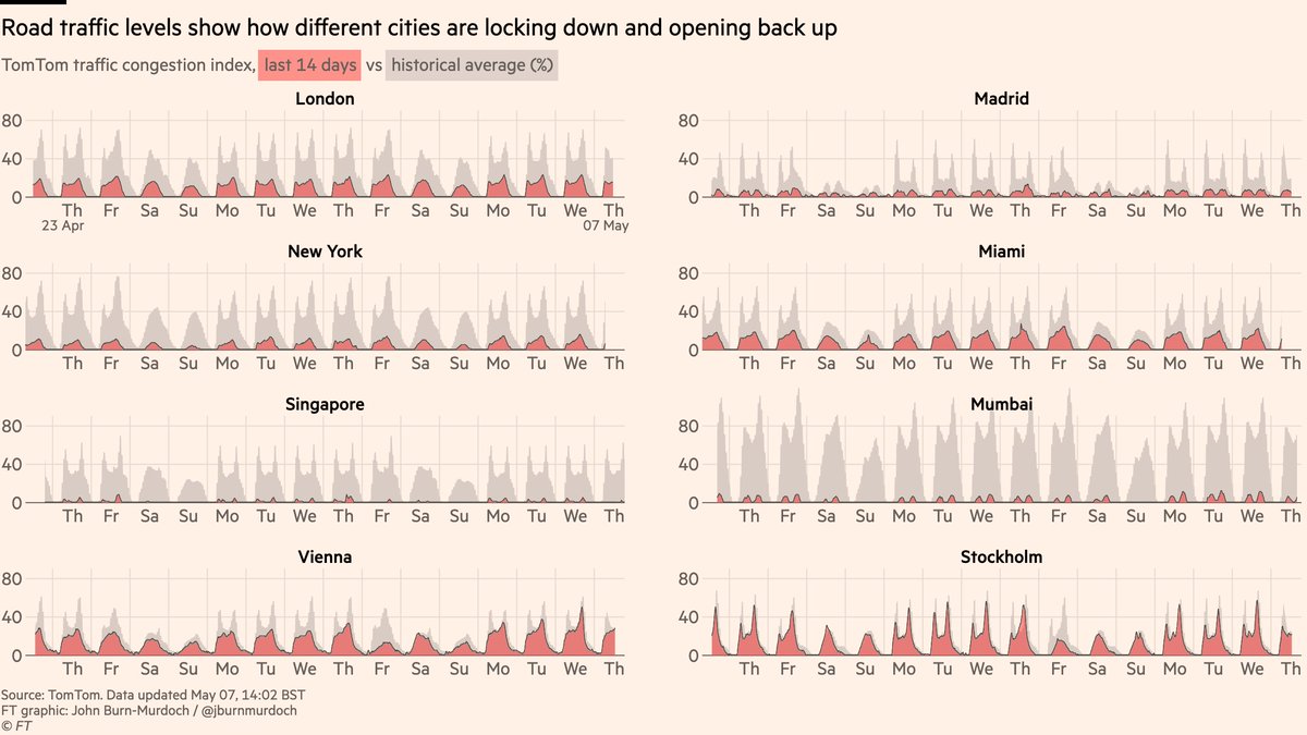 NEW: in yesterday’s UK gov press conf, we heard UK road traffic had risen We’ve been tracking this at @FinancialTimes for weeks using data from @TomTom, and it’s true: Londoners are on the roads much more than people in many foreign cities Live version: https://www.ft.com/content/0c13755a-6867-11ea-800d-da70cff6e4d3 … pic.twitter.com/4iT9o87Tb8