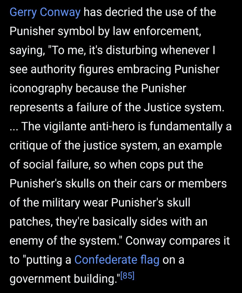 The Punisher's creator hated his character being co-opted by LE so much, he made it canon that Frank will fucking COME for any cop he sees trying to emulate him. #ACABpic.twitter.com/uUQmDKLBqc