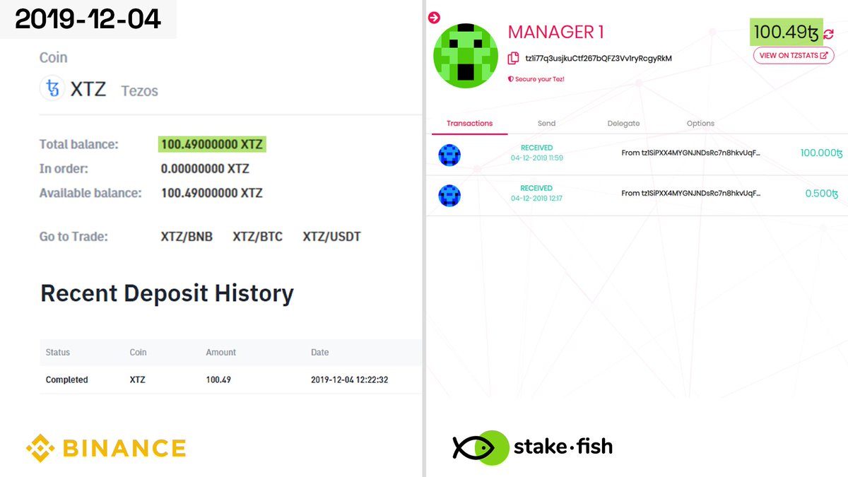 @tezos$XTZ with stakefish and@binance. On December 4, 2019, we deposited 100.49 XTZ to a Binance account and 100.49 XTZ to an account that staked to stakefish using@TezBox_Wallet.pic.twitter.com/HpHnfcPK3L