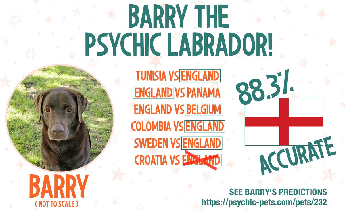 @psychicpets who is 100% England accurate: Barry the Psychic Labrador. And they have predicted England to beat Croatia. https://psychic-pets.com/pets/232/predictions/2145 …ধন্যবাদ। আপনার সময়রেখাকে আরো ভালো করে তুলতে টুইটার এটিকে ব্যবহার করবে। পূর্বাবস্থায়পূর্বাবস্থায় -