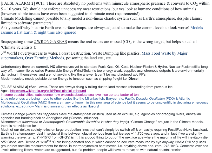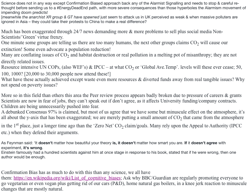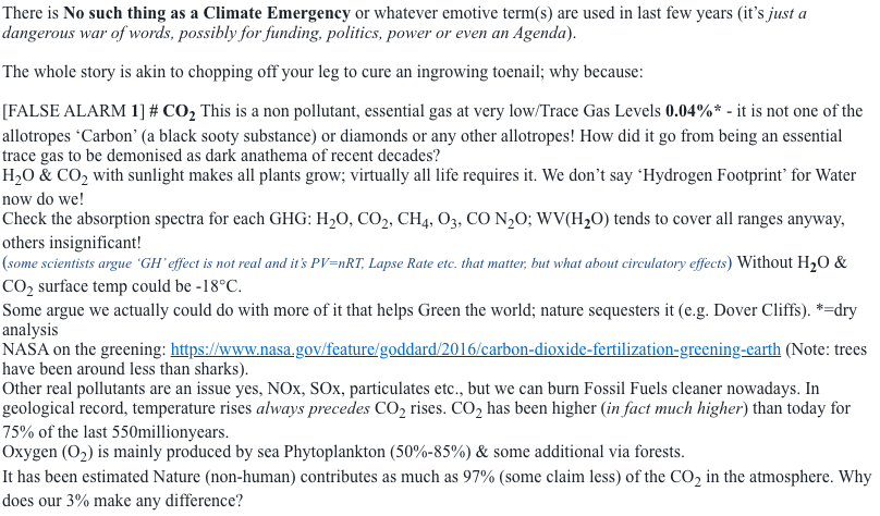 Additional thoughts: 1.Alarmists could put their lifestyles in tune & lead the way, 'money-mouth', getting rid of their FossilFuelled lifestyles now. 2.Many are arguing from & appealing to Self-Omniscience. 3.Not one of us knows all Unintended consequences of 'KneeJerk' policies.