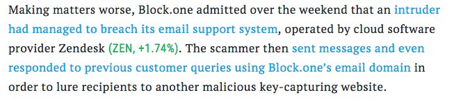 Oh, and this. The team that just raised $4 billion through the EOS ICO promptly had their customer support system hacked, allowing the hackers to send out phishing emails from the company. That is top notch security. http://fortune.com/2018/05/31/cryptocurrency-eos-ico-scam/ …pic.twitter.com/Ef1dJqnFfi