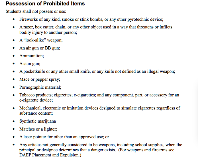 @tobin @Asher_Wolf Prohibited items: "Any articles not generally considered to be weapons, including school supplies" http://www.irvingisd.net/site/handlers/filedownload.ashx?moduleinstanceid=11409&dataid=10794&FileName=2015-2016_Student_Code_of_Conduct_ENGLISH.pdf …