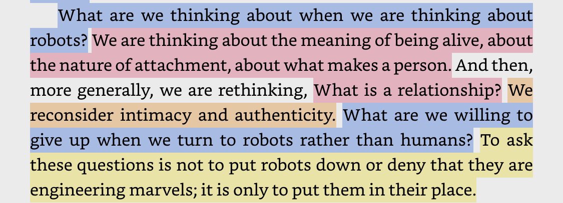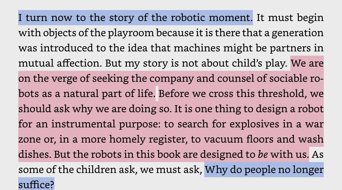 “We are on the verge of seeking the company and counsel of sociable robots as a natural part of life. Before we cross this threshold, we should ask why... It is one thing to design a robot for an instrumental purpose... But the robots in this book are designed to *be with us.”pic.twitter.com/cLYCE21lJK