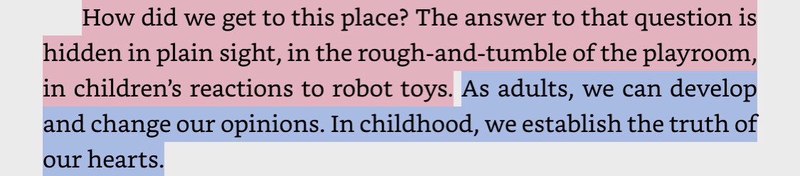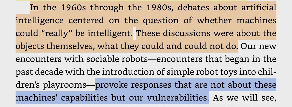 “These first computational objects of the playroom provoked a change in children’s way of sorting out the question of aliveness. [robots made]...children’s evaluation of aliveness less about cognition than about an object’s seeming potential for mutual affection.”pic.twitter.com/SuAS5i7FuV