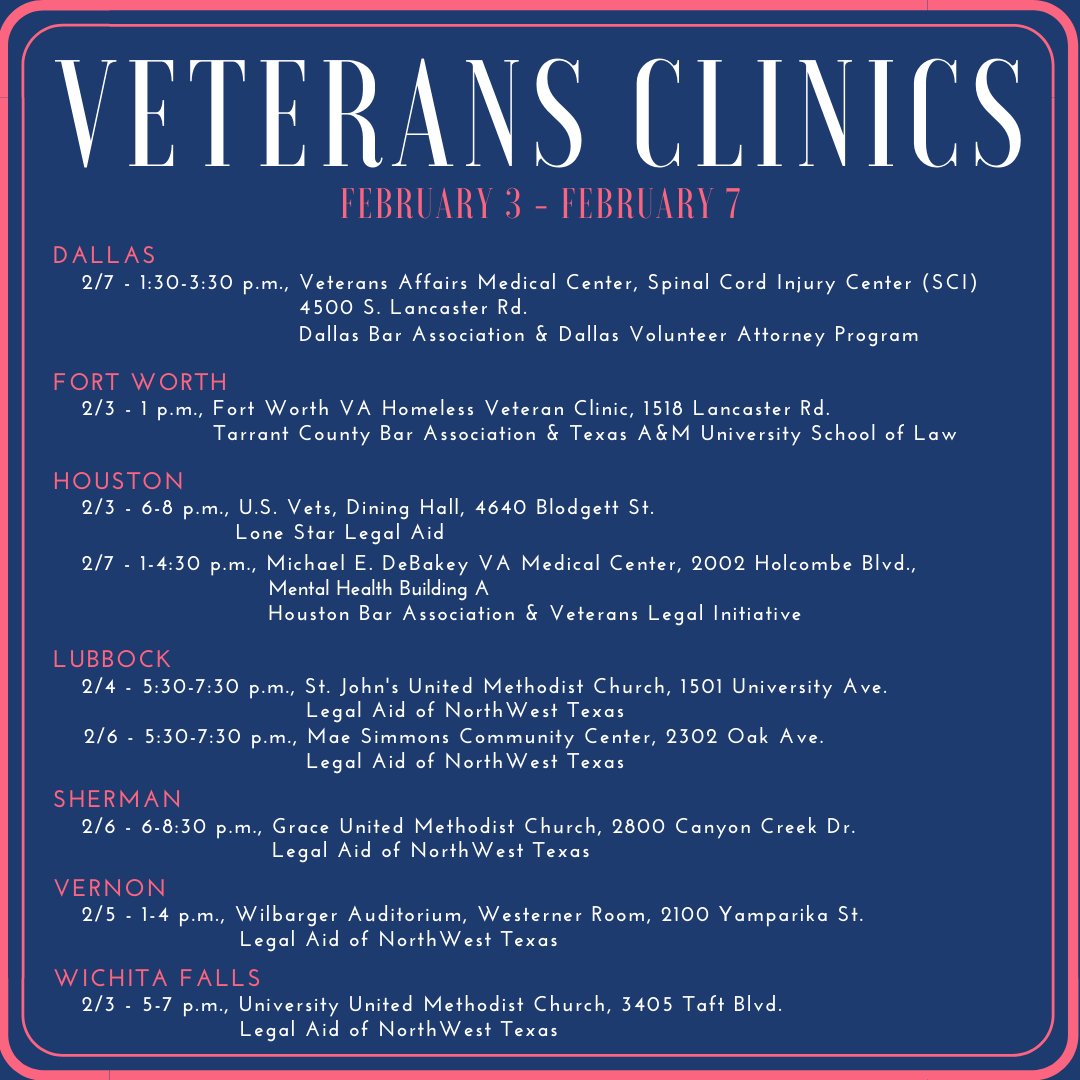 #veterans clinics will be held over the next week across the state. For a list of upcoming veterans clinics, visit http://ow.ly/Fgon30q58ME@DallasBarAssoc@DVAPprobono@TarrantBar@TAMULawSchool@LStarLegal@thehba@lanwtpic.twitter.com/2QH2KVpoL6