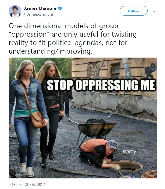 A Bourgeois cunt like James Damore would see doing useful and necessary labor as 'oppression'. This asshole doesn't care about workers or labor issues himself. Seriously, stfuhttps://twitter.com/delusionalcons/status/951055629665357824 …