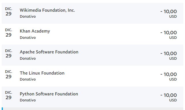 Ya he hecho las 5 donaciones! @ThePSF @linuxfoundation @TheASF @khanacademy @Wikimediapic.twitter.com/ig6tQpeaGt