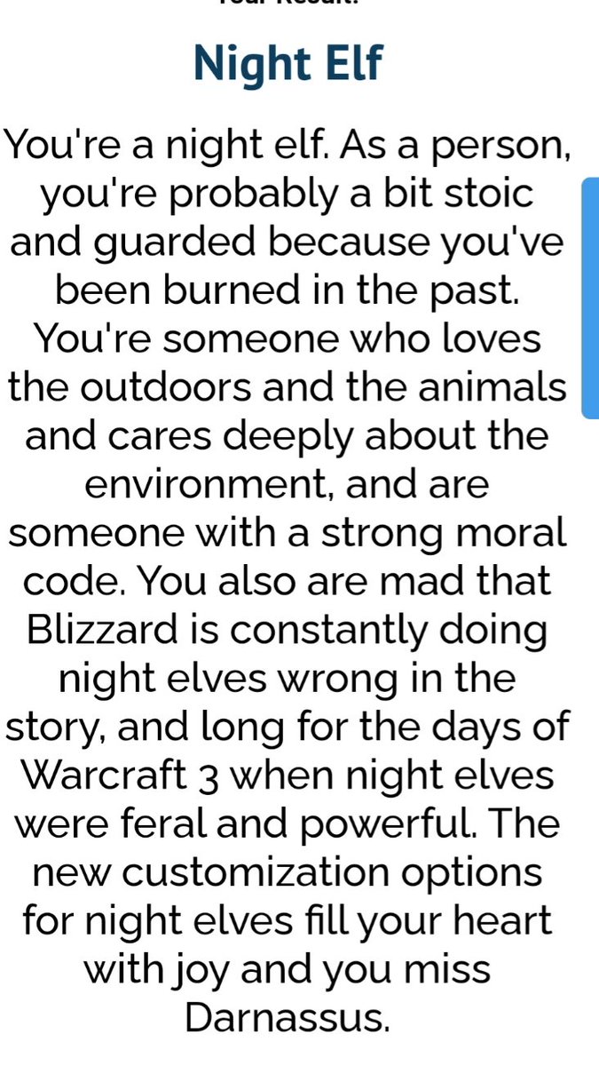I just got result 'Night Elf' on quiz 'Which type of elf from WoW are you?'. What will you get? https://uquiz.com/quiz/msAhDC?p=802078 … vía @uquiz