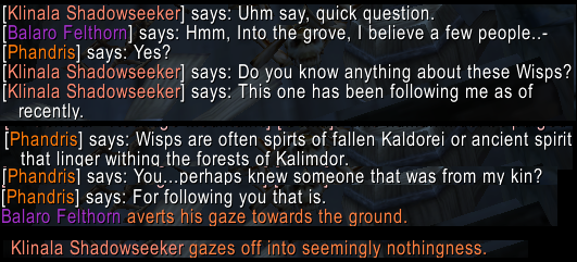 A void elf askes my druid why a wisp is following her around... i tell her beacuse is either a fallen kaldorei or ancient spirit. It was her friend....my heart q.q