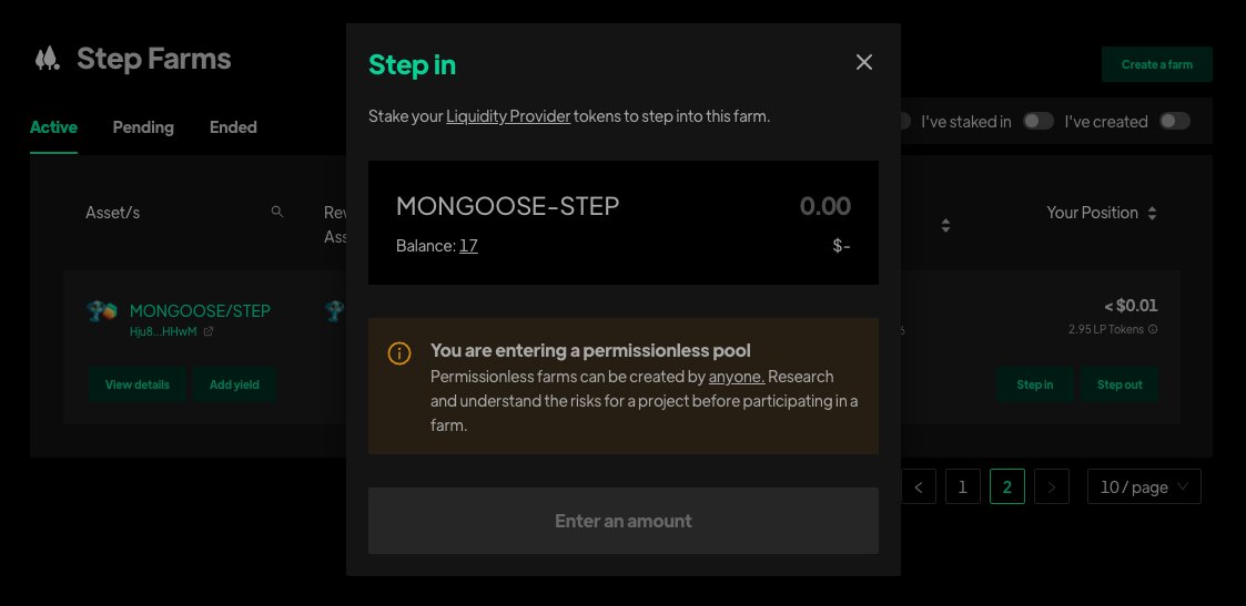 #Mongoose Farms 90M#Mongoosecoin already add yield to a farm 1. Go to https://app.step.finance/#/liquidity/add Add Liquidity#STEP &#MONGOOSE 2.Going to https://app.step.finance/#/farms Stake your Liquidity Provider 3. Enjoy your Pending Rewards#YieldFarming$MONG#SolanaAirdrops#Solana