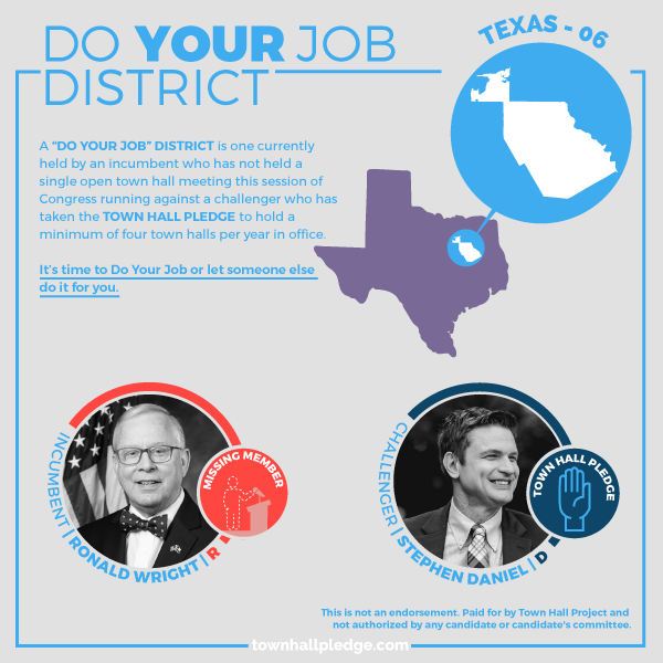 #TX06 Rep. Ronald Wright hasn't held a single open town hall in his entire term in Congress. Challenger@stephendaniel has taken the common-sense#TownHallPledge to his fellow Texans. This year, accountability is on the ballot in Texas.pic.twitter.com/WSmeqhikxq