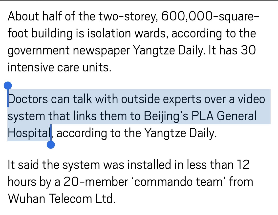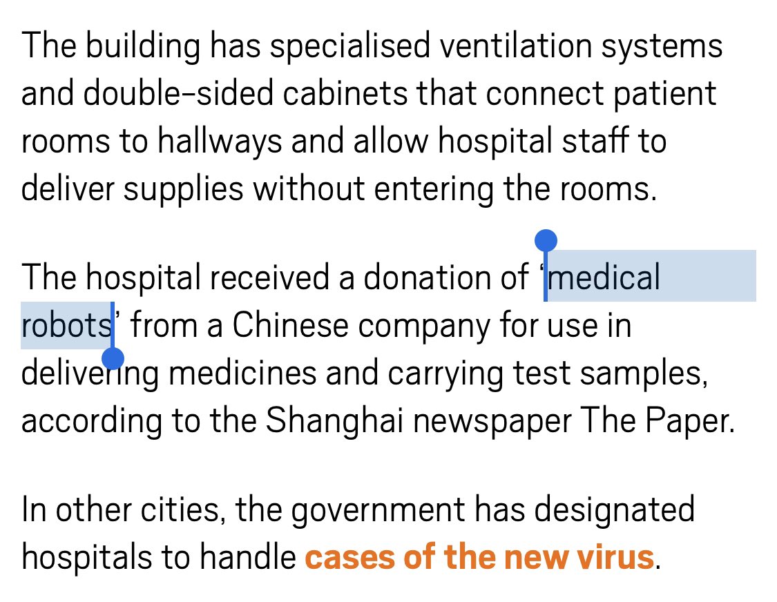 The coronavirus is driving wartime levels of medical innovation in China. Telemedicine, medical delivery robots, at-home diagnosis via drone — all these things existed to some extent but they will become standard of care. https://metro.co.uk/2020/02/03/coronavirus-hospital-1500-beds-opens-just-10-days-12171879/ …pic.twitter.com/YCC1syb0Zm