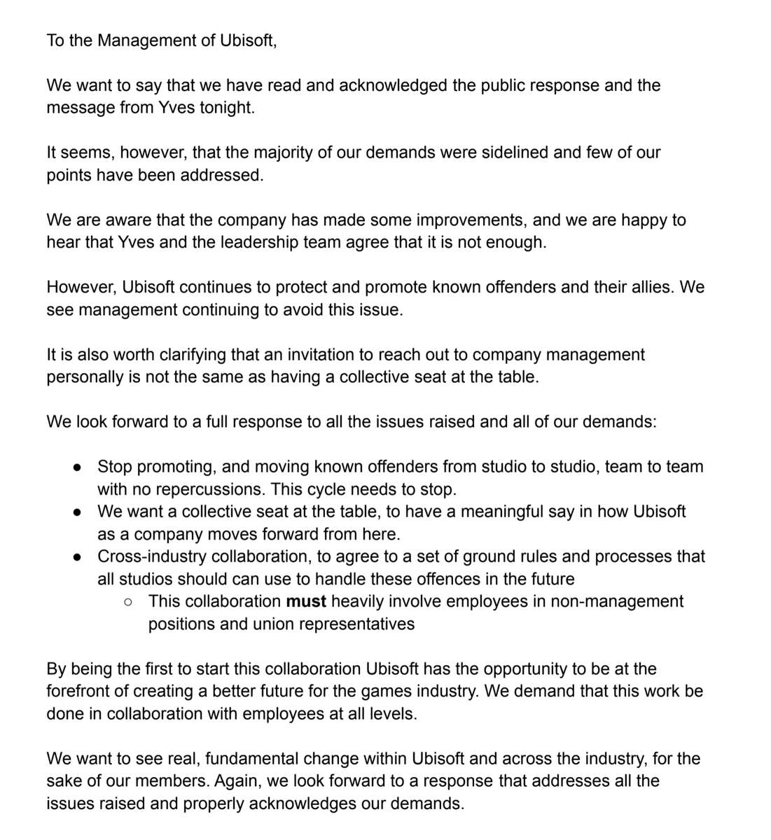 Statement from Ubisoft about the letter: says it takes the letter and issues raised in it seriously. No specifics in terms of new actions.pic.twitter.com/7q3tt50hLy