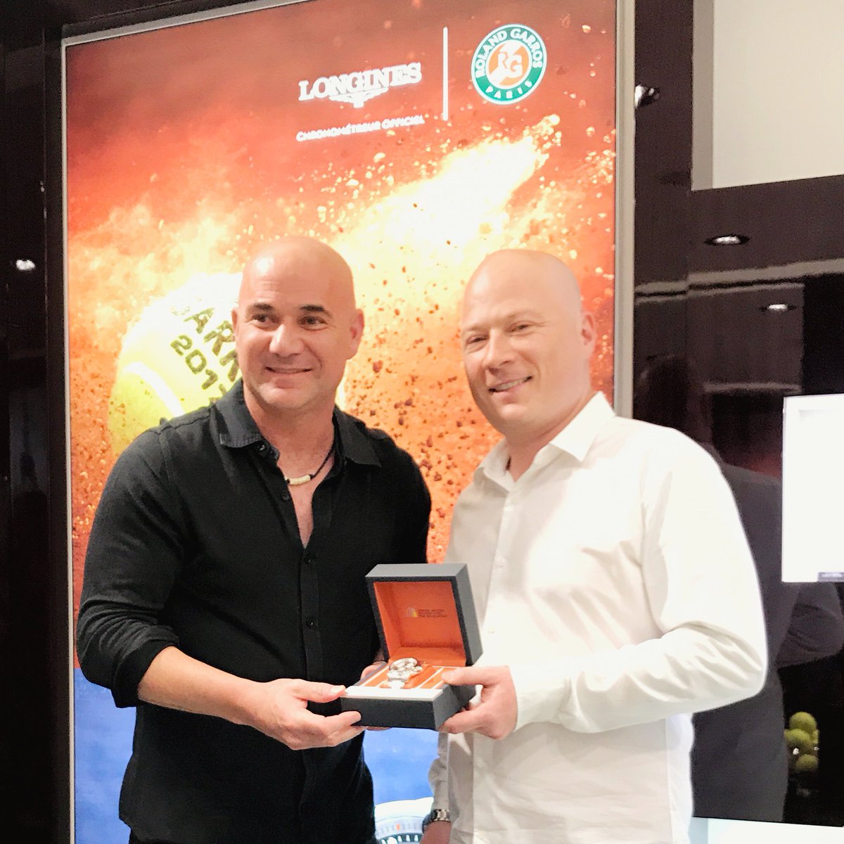 Avec André Agassi qui me remet ma Longines Roland Garros 3/10 exemplaires