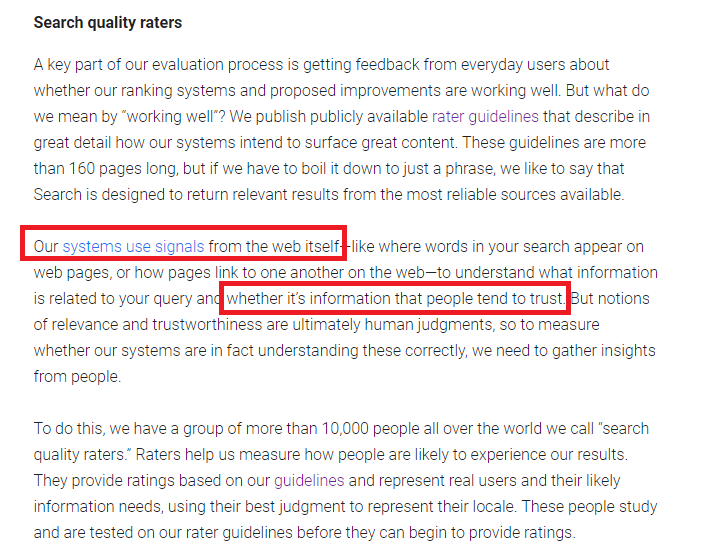 So many good nuggets in Google's new article about how it uses search quality raters. Yet another mention of how Google looks at "signals from the web" that correlate with relevance and trust. h/t