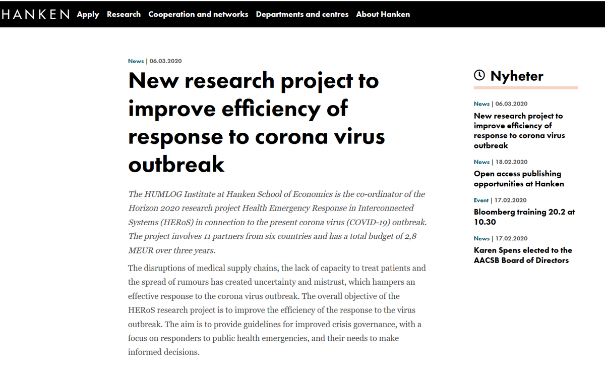 #ManagementPartner of the#H2020 HERoS project to improve efficiency of response to#coronavirus outbreak! The HERoS project which will soon start is led by@Hanken_fi & stands for "Health#EmergencyResponse in Interconnected Systems". https://www.hanken.fi/en/news/new-research-project-improve-efficiency-response-corona-virus-outbreak …pic.twitter.com/gPCIDkIydm