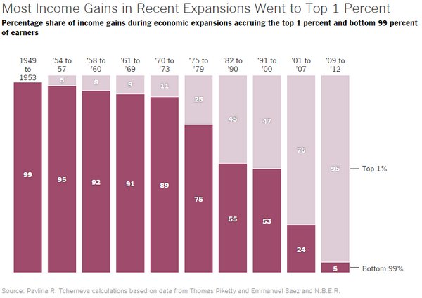Income gains going to top 1% in 1954-7: 5% 1975-9: 25% 2009-12: 95% http://nyti.ms/1BhNrQq pic.twitter.com/vFiCb8tAg5