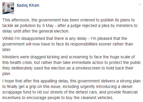 Good to hear Government attempts to delay publishing their plans to tackle air pollution have been rejected by the High Court.
