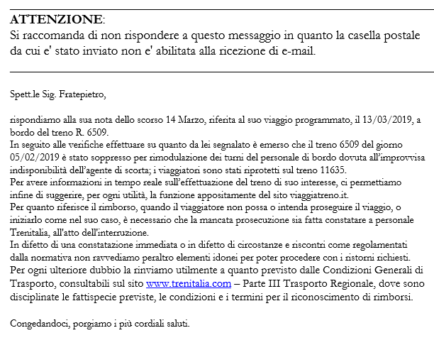 @LeFrecce mi liquida così per un biglietto (ben 1,50 euro) comprato on line, 10 minuti prima della partenza di un treno che non viene annunciato cancellato quando arrivo al binario. Cosa fate comprare un biglietto se il treno sapete che non parte? Si chiama truffa!pic.twitter.com/sZTCtlGavL