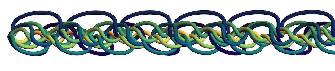 You can change coordinates to a model where the rotation symmetries act like normal rotations of R3. This makes the geodesics look more like actual helices, but the trade off is now the metric tensor looks complicated. Here’s a rendering of some geodesics in these coordinates.pic.twitter.com/P5Q53sqpym