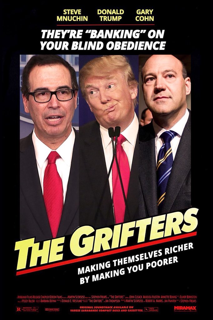 The last thing we need is a Goldman Sachs banker and mortgage reaper benefiting from tax cuts, deregulation, then crashing the economy again. Last time in 2008, families lost jobs, homes, savings. Wealth divide grew. P.S. Now Mnuchin can deduct his own private jet under