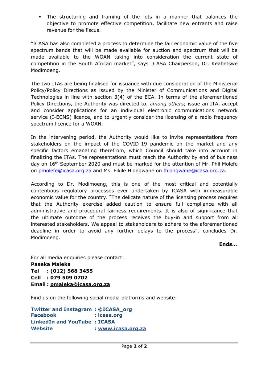 The Invitation To Apply (ITA) for both the Wireless Open Access Network (WOAN) and the International Mobile Telecommunications (IMT) spectrum, also known as high demand spectrum will be published no later than 30 September 2020.pic.twitter.com/lURcurr81G