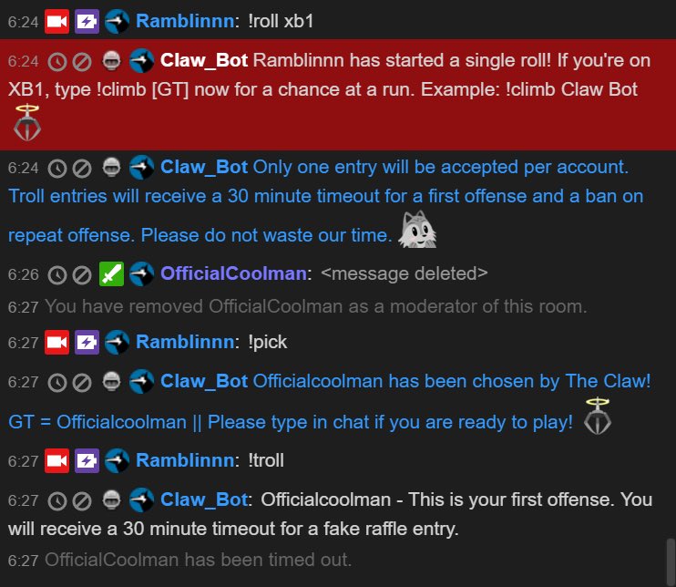 @stevryu Had people entering raffle with PSNs like 'realkraftyy' and 'ramblinnn.' Bot can now time them out on first offense, ban on second.