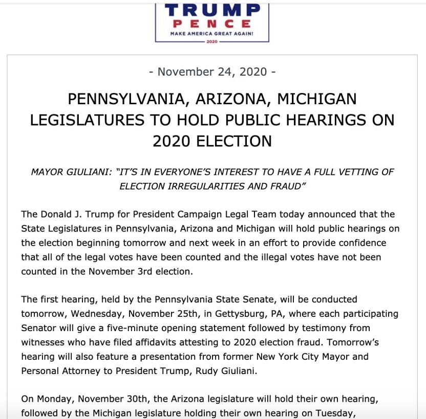 Breaking: Pennsylvania, Michigan and Arizona legislatures to hold public hearings on the 2020 election.pic.twitter.com/8NBLWOPVII